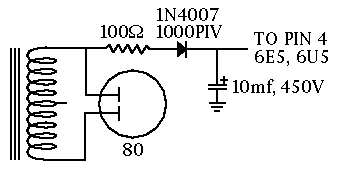 Connect a 100 ohm resistor, for protection, to one of the 80 tube plates. The other end of the resistor to the anode of a diode (1000piv). The cathode of the diode should go to the positive end of a 10 mfd 450 volt cap. The negative end of the cap goes to ground in the radio. Now remove the wire which connects pin 4 of the eye to B+ and connect pin 4 to the junction of the diode and 10 mfd cap.