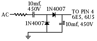 The 1629 tube can be used to replace 6U5, 6E5, 6G5, etc. tuning eyes if you make an adapter and increase the filament voltage to 12 volts. At first it seems like another filament transformer must be added but this is not necessary. The 1629 as well as most tubes will operate on AC or DC for the filament voltage. For AC radios you can make a simple voltage doubler that will convert the 6.3 volt filament of the original tuning eye tube to over 12 volts DC for the 1629. To make the doubler two 470 mfd capacitors and two 1N4001 or similar diodes are required. See the diagram below:
